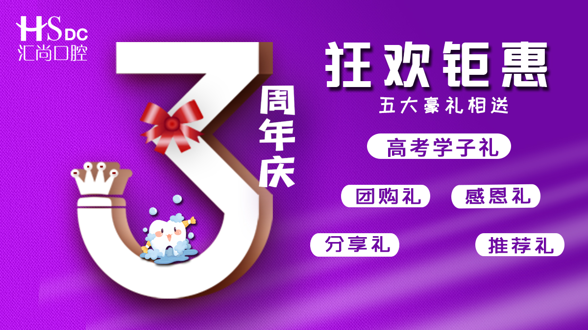 匯尚口腔3周年慶,感恩風(fēng)雨同舟、一路陪伴的您們,值此之際,誠意推出三年之約 感恩相伴 為您獻(xiàn)上五重豪禮!以答謝一路走過的新老客戶朋友。